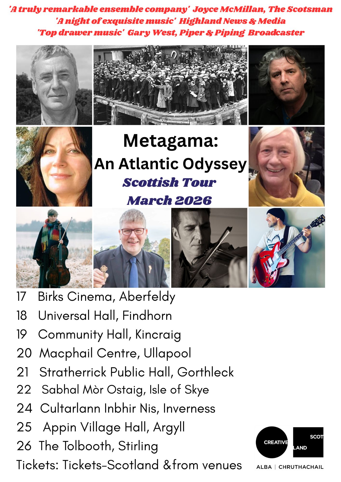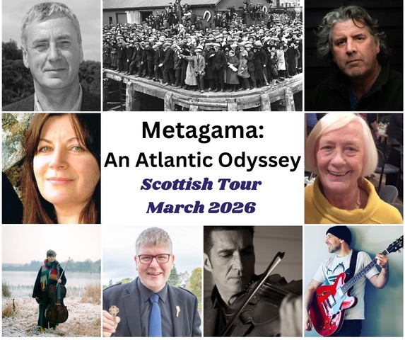Step aboard the SS Metagama, a journey that will take you from the Butt to Barra and on to the lakes and plains of Canada, to 1920s Detroit and Prohibition, through the ebb and flow of fortunes on both sides of the Atlantic, with the acclaimed musicians and singers of Metagama: An Atlantic Odyssey.