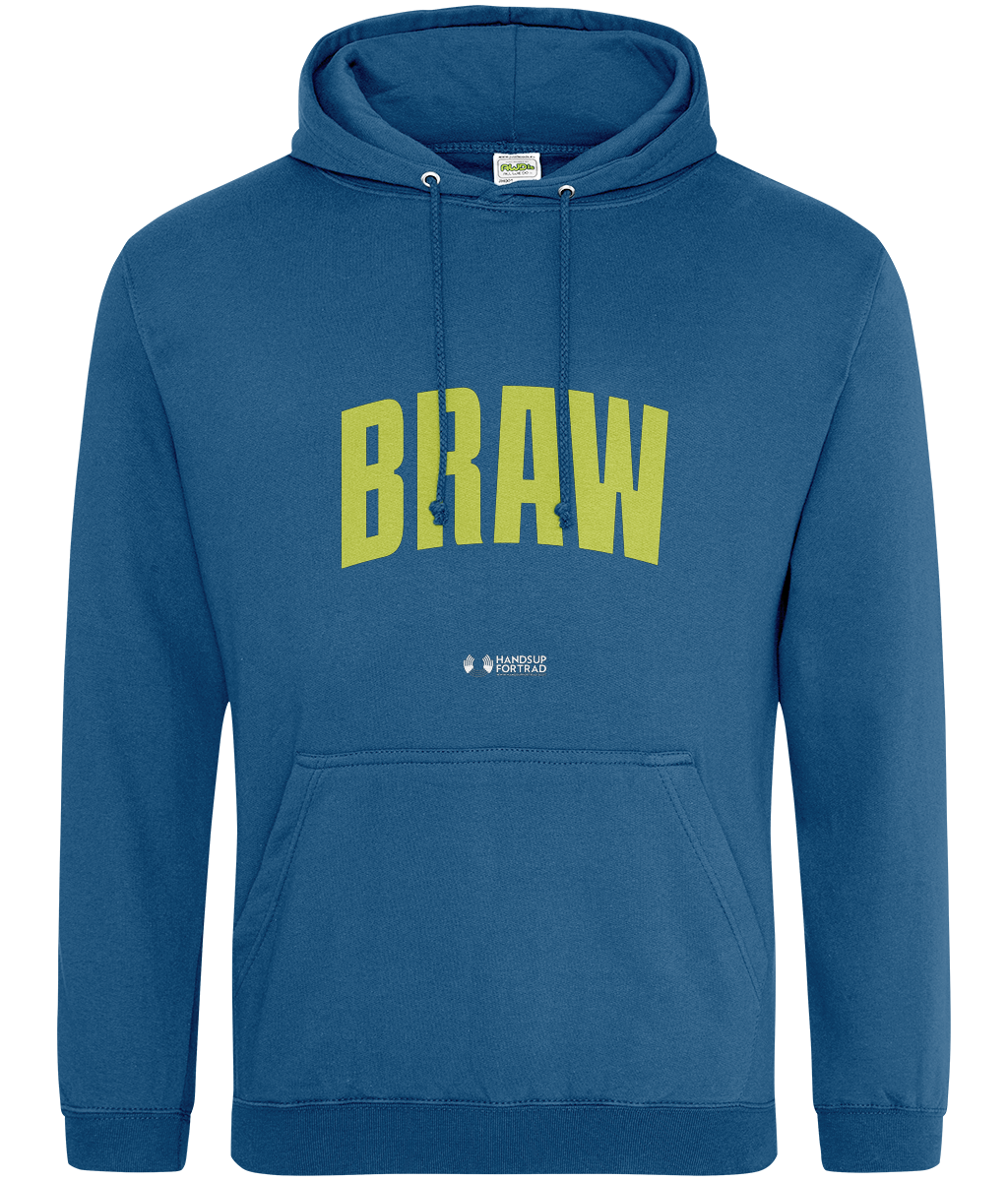 Braw is a Scots word for great / brilliant and fits many other moments. This hoodie is available in green and black. There is also a version with the writing in red.