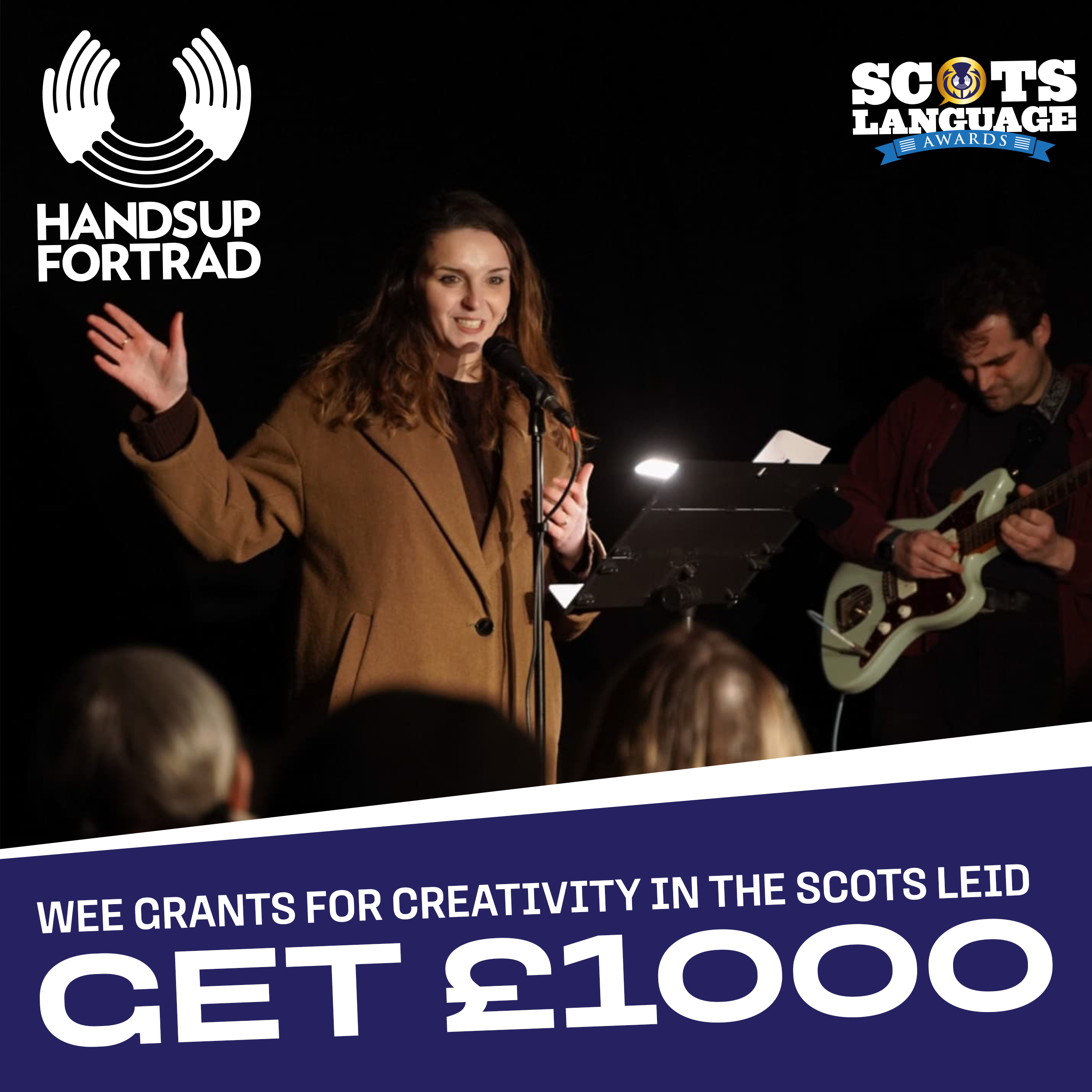 ‘Wee Grants for Creativity in the Scots Leid’ will gie oot grants o a thoosan pund. Oor ambition is tae gie this siller tae individuals, community groups or organisations wha will yaise it tae produce audience-facing creative wark. The wark maun be maistly in ae dialect o the Scots leid.